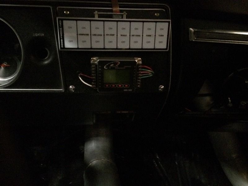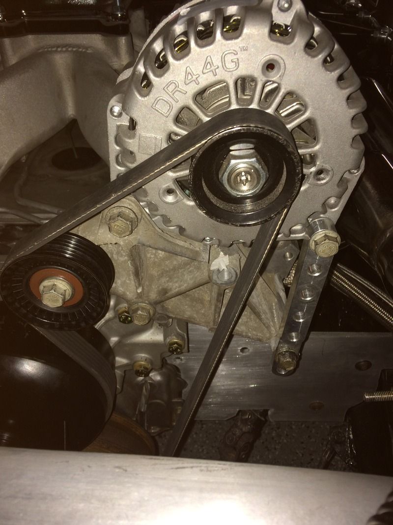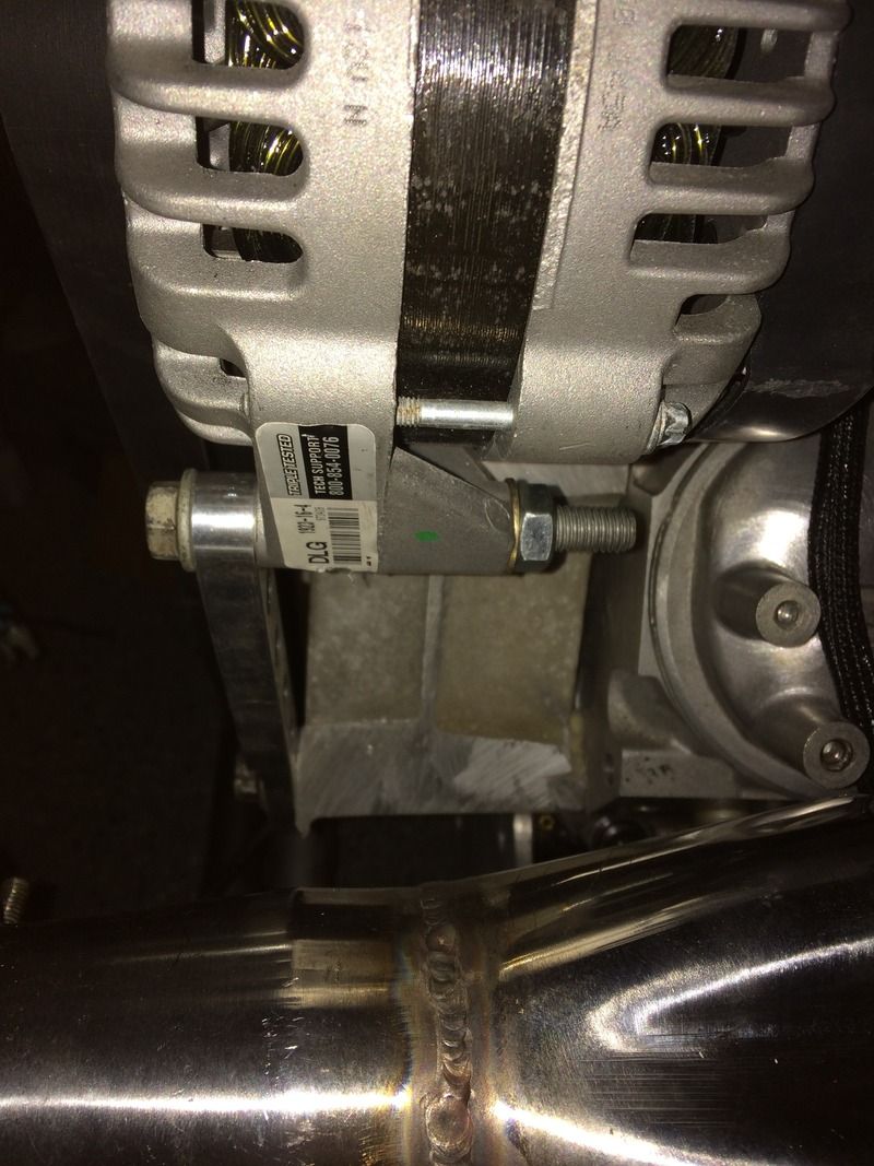 I got what I think is ok, an alternator mount. I cut the original truck bracket so it wouldn't interfere with the motor plate and then cut the other ears off to allow for adjustability. I also made the smooth pulley a ribbed pulley. The alternator is in the way of how I had my fuel line routed, so I had to order a 90 3/8 npt fitting to clear the alternator. I mounted and wired up my tach/shiftlight combo from my old car. Then I got a pair of relays ready for fan wiring.