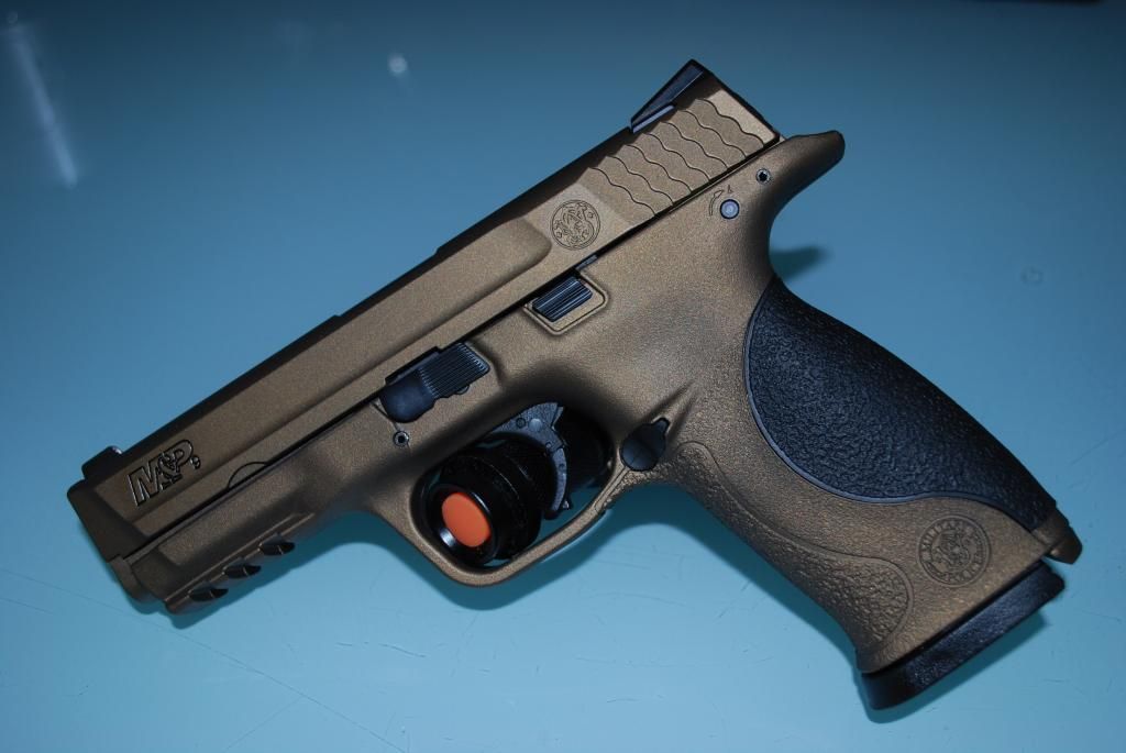 wait wait wait......first i thought the slide and frame was black...but a bright flashed was used...and the mag/trigger/slide lock/etc looked blue...i guess from the blue table top...if those parts are actually black..then yes..i see the bronze on the frame and slide....