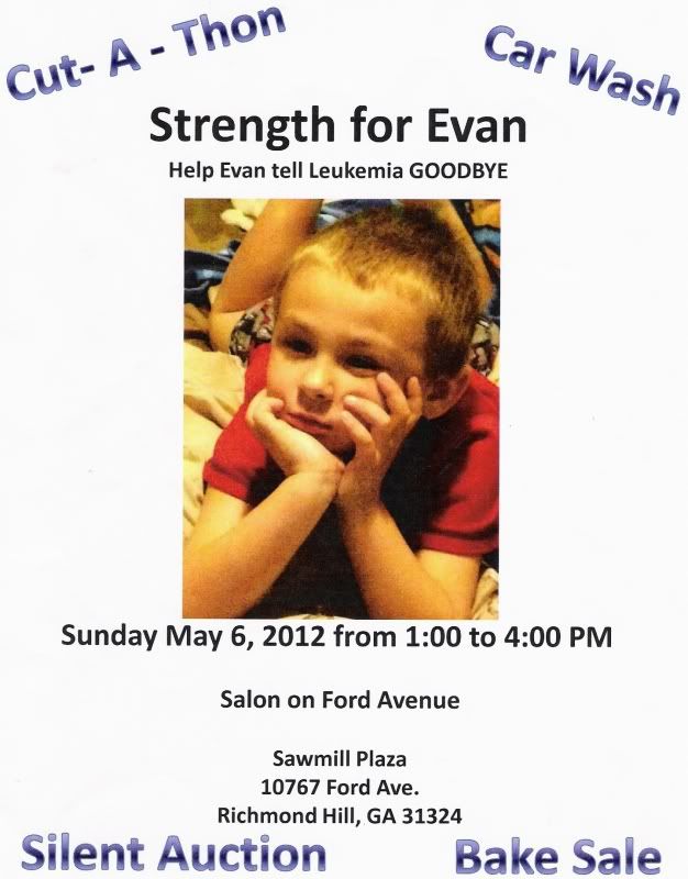 Sunday May 6th in Richmond Hill GA there will be a benefit Car Wash, Bake Sale and Silent Auction. Proceeds go to the Family of Evan Nelms who was recently diagnosed with Leukemia.