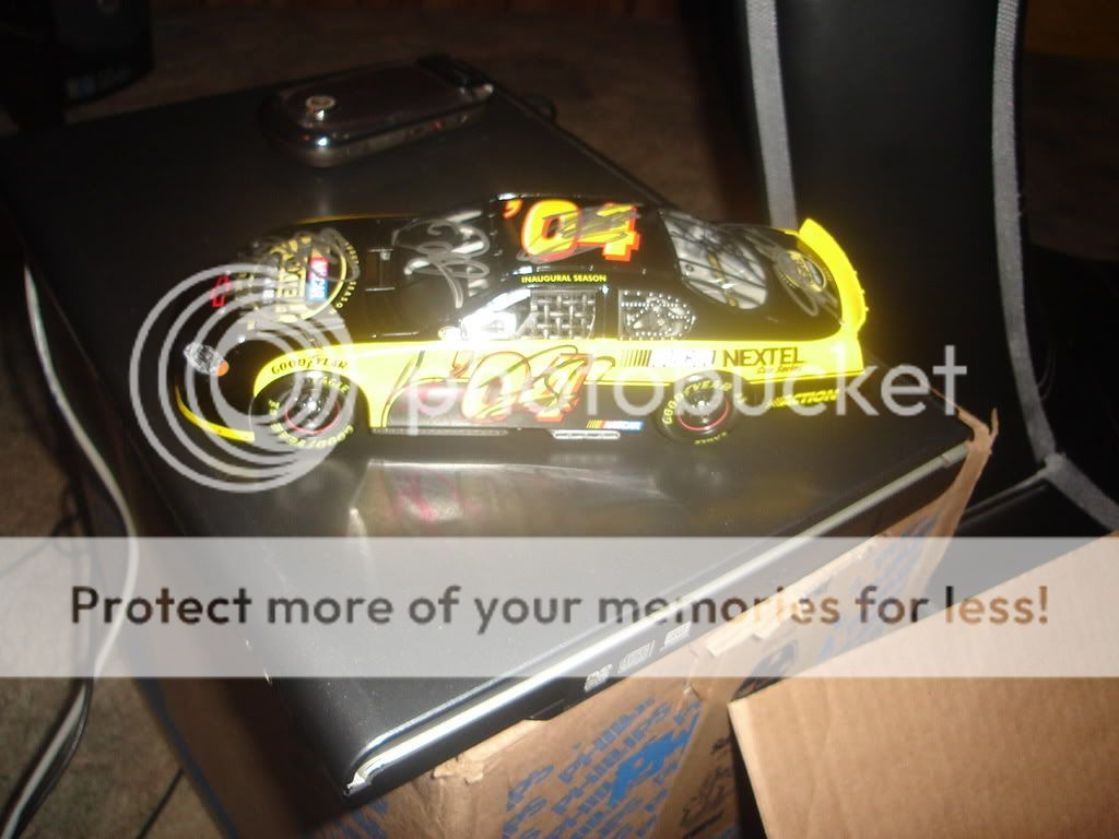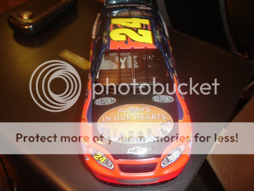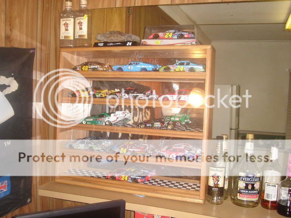 Some of the cars in my display case. The Jimmi Johnson, Richard Petty, Mark Martin and Force cars are autographed. The Black force car is the Earic Medlen tribute car. The Earnhardt car sad to say isnt signed but its a replica car from his last win. ![]() This one is the 2004 Chase car signed by all 4 chase drivers ![]() This one is the Hendrick memorial Jeff Gordon car. ![]() Ive got many more but i havent unpacked any of them yet. Being a big Gordon fan most of them are 24 cars but ive got others. |