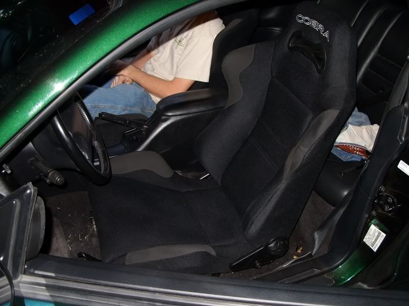 first up is the cobra daytonas I bought...took a sold 6hrs of work to make adapter plates so they could work. They are a good 15 to 20lbs lighter then the stock seats, and i got a manual slider for the driver side, so there goes another 20...its not much in the grand scheme of things, but until i start working out and eating right...i just negated me being 30lbs over weight and then some! lol