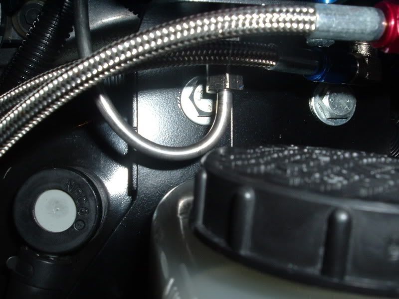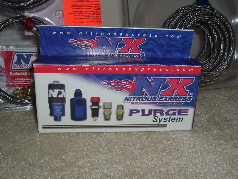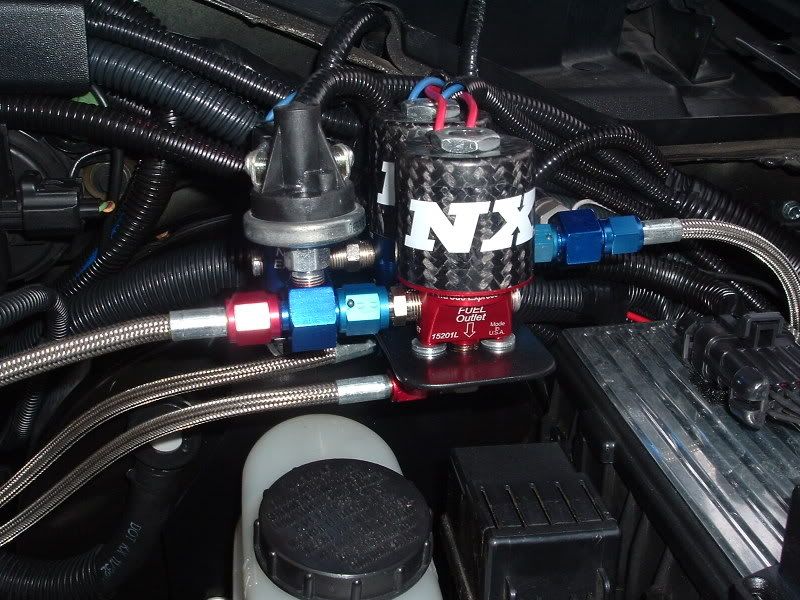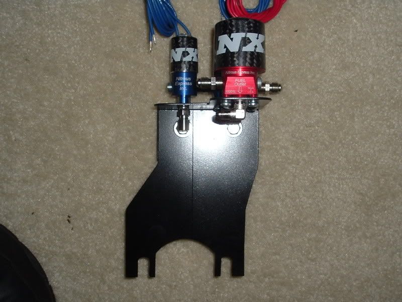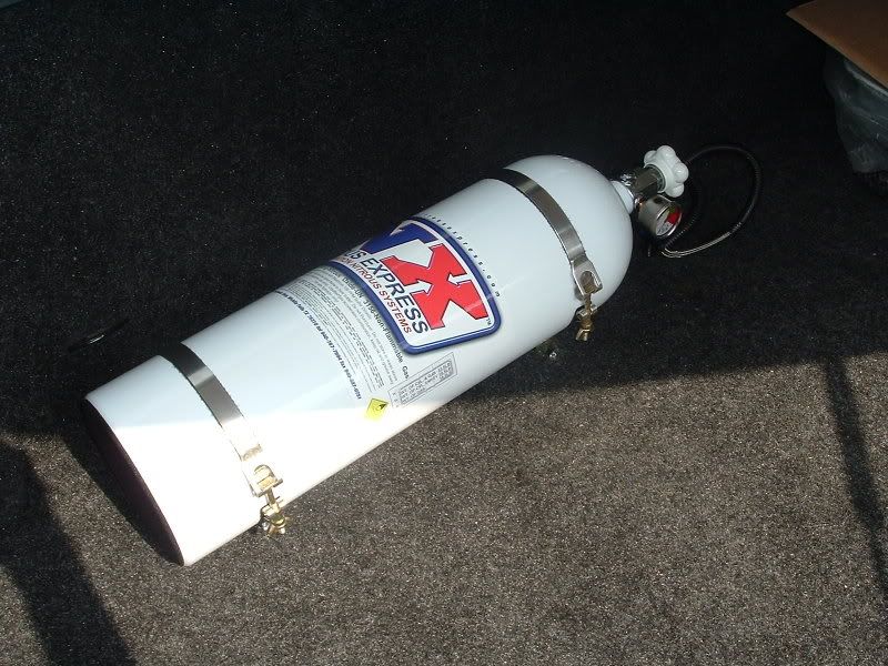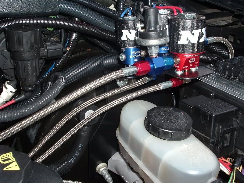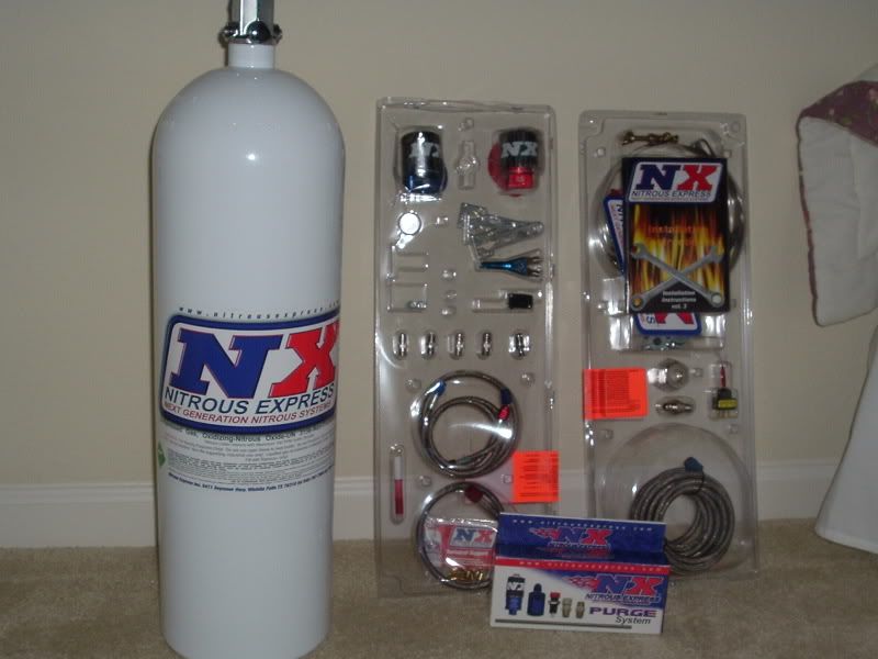 I finished up with installing all the nitrous components I currently have today. I'm still waiting on my NX Fire & Ice Pressure Controller, NX Nitrous Filter, and a NOS tube bender to finish the tube for the purge. I'm also waiting on the DGM Carbon Fiber Loom Cover set. I was going to install the NX Bottle Opener I won on EBay, but it doesn't fit right. It seems like it doesn't want to fit with the 45 degree nozzle on my bottle. Enjoy the pics. I know the engine bay is dirty.
